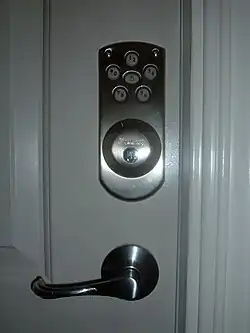 A Kwikset electronic lock with optional operation using a conventional key. This electronic deadbolt uses a Weiser keypad and is a hybrid combining features of Kwikset and Weiser brand locks. | |