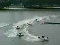 Once a race begins, boats fight for the best position entering the first turn marker. Race winners are often decided on the very first turn of the race.[4] The first boat across the line after three laps is the winner, with the first three finishers deciding the payouts for bets.[4]