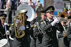 In 2017, the parade celebrated the 26th anniversary of Ukraine's independence.[18][19] 4,500 troops participated in the parade, along with 9 formations from NATO allied countries[20][21][22] The Secretary of Defense of the United States, and the Defense ministers of Georgia, Lithuania, Latvia, Moldova, Poland, Montenegro, Estonia, and the United Kingdom attended the ceremony.
