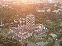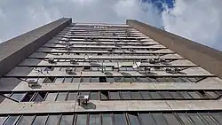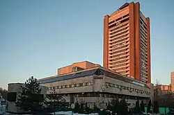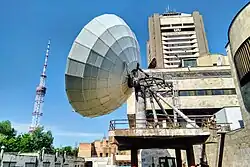 The Kyiv Television Center, or The Pencil, is a modernist skyscraper in Kyiv, and the current symbolic headquarters of Ukrainian public television broadcasting (it has been empty since the invasion).[1] The inception for the building occurred sometime in the 1960s, but its construction was delayed until 1983. It was built on the site of an old Jewish cemetery, which was removed in the 1970s.[2]
