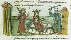 Vladimir had been prince of Novgorod when his father Sviatoslav I died in 972, but fled to Scandinavia in 977 after his half-brother Yaropolk killed his other half-brother Oleg.[124] According to the Primary Chronicle, Vladimir assembled a host of Varangian warriors, first subdued the Principality of Polotsk and then defeated and killed Yaropolk, thus establishing his reign over the entire Kievan Rus' realm.[124]