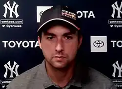 After starting his major league career 0-for-22, the longest hitless streak to start a Yankee career of any position player ever, he had his first major league hit, a home run, on July 1 against David Price of the Boston Red Sox.[18] His next two hits, on July 3 and 4 against the Atlanta Braves, were also home runs, making him the ninth MLB player since 1920 whose first three major league hits were home runs.[19][20] With the Yankees in 2018, he batted .167/.241/.319 in 72 at bats.[5] In 2019, Higashioka batted .214 with three home runs and 11 RBIs in 18 games with the Yankees.[5]