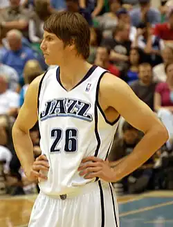 On December 29, 2007, Korver was traded to the Utah Jazz in exchange for Gordan Giriček and a future first-round draft pick.[20][21] On February 6, 2008, he scored a season-high 27 points against the Denver Nuggets.[22]