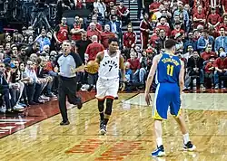 Lowry entered the playoffs suffering from bursitis in his shooting elbow, as he shot a mere 32% from the field over the final 10 games of the regular season.[61] His poor shooting continued into the postseason as the Raptors faced the Indiana Pacers in the first round. Despite Lowry's struggles, the Raptors defeated the Pacers in seven games, winning their second playoff series in franchise history, their first since 2001, and their first seven-game series.[62] In Game 3 of the Raptors' second-round series against the Miami Heat, Lowry broke out of his shooting slump with a 33-point performance on 11-of-19 shooting, helping the Raptors win 95–91 and go up 2–1 on the series.[63] In Game 6 of the series, he tied his playoff career high with 36 points on 12-of-27 shooting in a 103–91 loss, as the Heat forced a Game 7 in Toronto.[64] In Game 7 of the series, he scored 35 points on 11-of-20 shooting, to go along with nine assists, seven rebounds, and four steals, in a 116–89 win, helping the Raptors advance to the Eastern Conference Finals for the first time in franchise history.[65] In Game 4 of the Conference Finals against the Cleveland Cavaliers, Lowry scored 35 points on 14-of-20 shooting to help the Raptors win 105–99 and tie the series at 2–2.[66] In Game 6 of the series, Lowry again scored 35 points, but was unable to force a Game 7, with the 113–87 loss knocking the Raptors out of the playoffs with a 4–2 defeat.[67] Lowry capped off his strong season by earning All-NBA third team honors. With his first selection to the All-NBA team, he joined Vince Carter and Chris Bosh as the only players in franchise history to receive this recognition.[68]