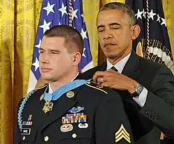 After the battle, paperwork regarding a potential Medal of Honor awarding was delayed in the Pentagon.[7] On May 14, 2014, White received the Medal of Honor in a White House ceremony, for administering life-saving medical aid to comrades and for radioing situational reports;[6] that battle resulted in five soldiers (1st Lt. Matthew C. Ferrara, Sgt. Jeffery S. Mersman, Spc. Sean K. A. Langevin, Spc. Lester G. Roque, and Pfc. Joseph M. Lancour) and Marine Sgt. Phillip A. Bocks being killed and all eight surviving Americans being wounded.[1] White became the seventh living recipient of the Medal of Honor from either the Iraq War or Afghanistan operations.[8] The following day, White was inducted into the Pentagon's Hall of Heroes by Deputy Defense Secretary Robert O. Work.[9]