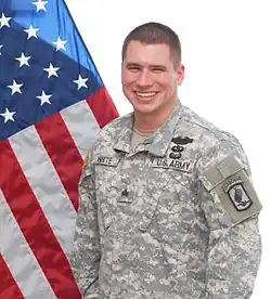 White was born on March 27, 1987,[2] and lived in Bonney Lake, Washington.[3] He enlisted in the United States Army on February 15, 2006, attending basic training, advanced individual training, as well the United States Army Airborne School consecutively, at Fort Benning.[2] White's military education includes the Combat Life Saver Course, United States Army Air Assault School, Infantryman Course (One-Station Unit Training), Primary Leadership Development Course and Reconnaissance and Surveillance Leaders Course.[2]