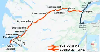 The Kyle of Lochalsh line runs east-west and links the town of Dingwall, on the east coast of the Highlands at the tip of the Cromarty Firth, with the village of Kyle of Lochalsh on the west coast, close to the Isle of Skye. The line lies entirely within the former county of Ross and Cromarty, part of the modern day Highland council area.