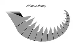 The head of Kylinxia covered by a fused carapace with rounded genal corner comparable to those of the megacheiran Haikoucaris.[8][1] Similar to the purported basal arthropod Opabinia,[9][10] the head was initially suggested to have borne five eyes that were attached through eye stalks,[1] however a later 2023 study suggested that there were only three eyes, one central medial eye and two lateral eyes.[6] In contrast to the fused proboscis of Opabinia[11] and the hand-like great appendages of megacheirans, the head region of Kylinxia has a pair of unfused, 16-jointed frontalmost appendages each of which has terminal and paired, serrated inner spines (endites), similar to those seen in the radiodont[2] genera Anomalocaris (overall proportion) and Ramskoeldia (endites).[12][1] Unlike radiodonts, the frontalmost appendages face upward and lack outer spines, which is a feature shared by the great appendages of megacheirans.[8][1]