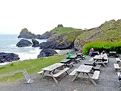 Kynance Cove (Cornish: Ben Kewnans, meaning foot of steep-sided valley) is a cove on the eastern side of Mount's Bay, Cornwall, England. It is situated on the Lizard peninsula approximately two miles (3 km) north of Lizard Point.[1] The cove became popular in the early Victorian era, with many distinguished visitors including Queen Victoria and Prince Albert[2] and the poets Alfred Tennyson and Algernon Swinburne.[3] The BBC has described Kynance Cove as "one of the most beautiful stretches of coastline in the South West".[4] The South West Coast Path, which follows the coast of south west England from Somerset to Dorset passes by on the cliffs overlooking the cove.[1]