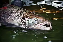 Many male trout (e.g. Brown trout (Salmo trutta) and rainbow trout (Oncorhynchus mykiss)) and salmon develop a kype prior to spawning periods.[5] In pre-spawning Salmo and Salvelinus males, the lower jaw elongates and the hook develops; female salmon do not develop a kype.[3] Bull trout (Salvelinus confluentus) are adfluvial (adults spawn in streams but subadults and adults migrate to lakes for feeding) and sometimes develop a kype, however, although this may occur in some populations, it remains absent in others.[6]