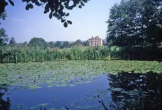 The grounds were laid out in the second half of the 18th century. There is a semicircular string of five pools looping west from the house; these envelop a lawn of width about 200 metres (660 ft), which slopes gently away from the house. Between the pools there are ornamental cascades and bridges.[1][3]