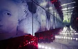As soon as the viewers, who have been provided with ruffed collars, enter the room, they are dominated by the appearance of an endless array of ruff collars and view themselves through endless reflected images. The small room is transformed into an infinite world, while a viewer from outside the room will see a distorted shadow through the window. The opulent interior of the mirror room is simply perceived as flat shadows and reflections from the outside.