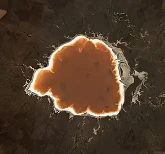 Kyzylkak is an endorheic lake located in the Ishim Plain, south of the Russian border. It lies in the lowest part of a large depression and its shores are very steep. The bottom of the lake has a thick layer of black mud containing magnesium salts and releasing Hydrogen sulphide.[5] Lake Kyzylkak is fed mainly by snow, but owing to its high salinity it does not freeze in the winter.[6]