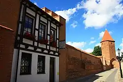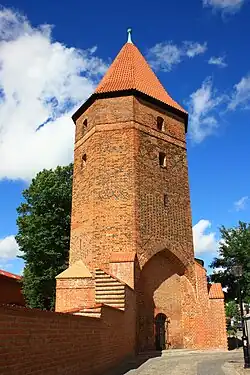 After the outbreak of World War II, the persecution of indigenous Poles, including Kashubians, intensified, and the patients of the local psychiatric hospital were murdered in Piaśnica, however, the Polish resistance movement remained present in the district.[18] In 1942, the Germans founded a subcamp of the Stutthof concentration camp and sent prisoners from the Buchenwald concentration camp there.[19] Further prisoners were sent from the main Stutthof camp, and the subcamp was dissolved only in February 1945, during the German-organized evacuation of the Stutthof main camp.[19] The Germans also operated a forced labour subcamp of the Stalag II-B prisoner-of-war camp for Allied POWs in the town.[20] The town was occupied without resistance by the Soviet Red Army on 10 March 1945. Most of the Old Town burned in the subsequent Soviet rampage, although the Gothic Church of St. James and the Teutonic castle survived.[14] During this time about 600 people committed suicide.[21]