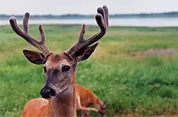 In order to make Anticosti Island a hunter's "paradise", several animal species have been introduced; starting in 1896, the island became an unprecedented biological experiment. In all, sixteen introduced species have been attempted, with six proving to be unsuccessful, namely bison, caribou, elk, mink and fisher. However, for ten species, it has been a beneficial introduction; six species of terrestrial mammals (white-tailed deer, moose, beaver, snowshoe hare and muskrat), two species of frogs, and two species of non-migratory birds (ruffed grouse and the spruce grouse). Of all these species introduced, the "success" of white-tailed deer is particularly noteworthy. From an initial group of about 200 (introduced in 1896 and 1897), the number of white-tailed deer has grown to an estimated 37,000 animals in 2018, representing a density of 4.7 deer/km2.[7][26] Without predators, this man-made deer population has had noticeable impacts on the island ecosystem. Balsam fir trees covered about 40% of the island, prior to the introduction of the deer. The deer eat tender sprouts from the ground, and prevent fir regeneration; in turn, the firs are being replaced by white spruce.[33]
