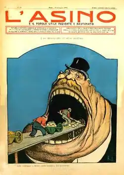 L'Asino (English: "The Donkey") was an Italian magazine of political satire founded in Rome in 1892, by Guido Podrecca (1865–1923) and Gabriele Galantara (1867–1937), a former mathematics student, designer and cartoonist, both with a socialist background. The two took the pseudonyms "Goliardo" (Podrecca) and "Ratalanga" (Galantara), and with these nicknames signed the outputs of the weekly. The magazine's title was from a saying of Francesco Domenico Guerrazzi that said that "the donkey is like the people: useful, patient and stubborn" (Italian: come il popolo è l'asino: utile, paziente e bastonato), which became the subtitle and the motto of the editors.[2][3][4]