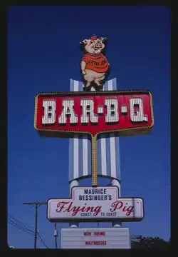 Bessinger, along with his brother Joe Jr., opened their first drive-in restaurant, Maurice's Piggie Park, in West Columbia, South Carolina in 1953.[1][2] By 1968, he had four drive-ins,[3] and by 2002 the chain had grown to nine restaurants.[5] The South Carolina-style barbecue was and continues to be well-regarded, and Piggie Park has been included in multiple compilations of the best barbecue in the United States.[6][7] On October 26, 2024, the Maurice's Barbeque offices, smoke pits and side factory in West Columbia caught fire and burned down. The restaurant and historic sign survived.[8]