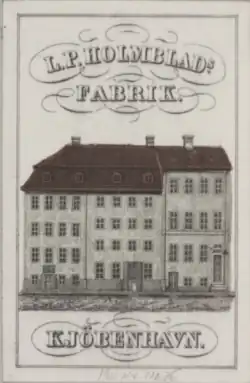 After Jacob Holmblad's death in 1837, his son, L. P. Holmblad managed the company on behalf of his mother. In 1841, he established a production of whale oil. After his mother ceded the ownership to him in 1842, he also founded a candle factory, which was the first in Denmark to use stearin in the manufacture of candles.[1] It was a great success and had to be expanded in 1847.[2] In 1880, L. P. Holmblad moved their production of stearin candles to Blegdamsvej, where they had acquired O.F. Asp's candle factory which was expanded by Hans Jørgen Holm. The company also constructed a new factory in Amager in 1880.[4]