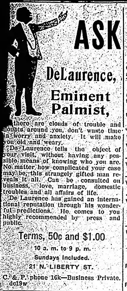 - ^ "Prof. de Laurence the Palmist". The Daily Item. 1906-10-06. p. 9. Retrieved 2025-05-02.