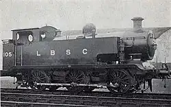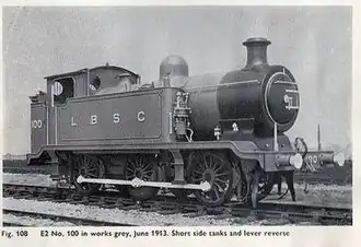 Because of the inadequate water tank capacity on the first five engines, Billinton gave the next batch of five engines with extended side tanks, increasing up to 1,256 imp gal (5,710 L; 1,508 US gal).[3][5] The second batch, Nos. 105-109, were delayed by the onset of World War I, but were eventually delivered between June 1915 and October 1916, costing £2,217 each.[5] The new E2s were allocated to London for use as station pilots, shunting empty coaches in and out of London Bridge and Victoria stations, but the increased demand of wartime saw them required to move wagons out to the northern and western railways.[5]