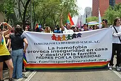 In 2007, some 71% of Mexican youth would not approve if the same rights were given to homosexuals as heterosexuals.[49] A 2006 survey states that 33% of Mexicans feel aversion for homosexuals, some 40% do not like politicians who emphasize homosexuality, and some 32% do not like homosexual neighbors.[50] Homophobia is also deeply rooted in the family. In 2004, only four families of those murdered in homophobic crimes, of a total of 26, offered to give information on the matter to an investigation commission.[50]