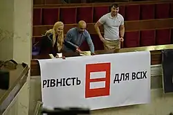 A draft law that would make it illegal to talk about homosexuality in public and in the media and to import, distribute, and broadcast video, photo, and audio products that "encourages homosexuality" (with penalties of up to five years in prison and fines for up to ₴5,000 (US$616))[95] was passed in first reading in the Verkhovna Rada (Ukrainian Parliament) on 2 October 2012.[87] An estimated 20 community activists representing several organizations protested outside of the Verkhovna Rada building during the vote.[96] On 4 October 2012, a second vote was tentatively scheduled for 16 October.[96][82][97][98][87][99] This law was deemed homophobic by the LGBTQ community and human rights organisations and condemned by Amnesty International, the European Union, and the United Nations.[87] The Venice Commission concluded in June 2013 that the bill was "incompatible with the European Convention on Human Rights and international human rights standards".[100] In January 2015, the bill was removed from the agenda.[101][102]