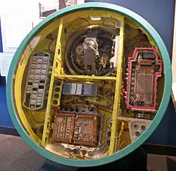 Since the guidance program would not be running while the missile sat in the silo, the same computer was also used to run a program that monitored the various sensors and test equipment. With older designs this had been handled by external systems, requiring miles of extra wiring and many connectors to locations where test instruments could be connected during servicing. Now these could all be accomplished by communicating with the computer through a single connection. In order to store multiple programs, the computer, the D-17B, was built in the form of a drum machine but used a hard disk in place of the drum.[20]: 160