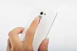 The G2's exterior consists of a polycarbonate shell—unlike its predecessor, which used a glass-based construction. The rear cover is adorned with a subtle pattern resembling carbon fiber.[9][10] The G2's volume and power keys are now located directly below the camera on the rear of the device, whereas before they were located on the sides of the device. The power button contains an LED lamp, which can be used as a notification light. The positioning of the buttons on the rear deviates from the majority of smartphones, where they are located on the bezel (side edge) of the phone. LG argued that buttons located on the bezel were harder to reach on larger smartphones, and made it more likely for users to drop their phone when adjusting the volume during a call. As such, the G2's buttons are instead located where the index finger would normally lie when the phone is held. Alongside the power button, the G2 is also powered on by double-tapping on the screen, and turned off by double-tapping on the status bar or a blank area on the home screen, a feature branded as "KnockOn". When the phone is off, the volume keys can also be used to launch directly into the camera or QuickMemo applications by holding them down.[9][11][12]