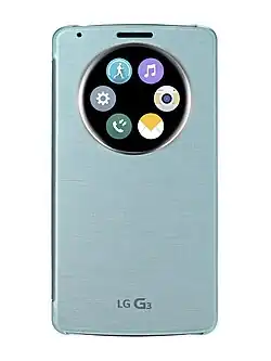 Prior to the unveiling of the G3 itself, LG unveiled the device's QuickCircle Case accessory. A successor to the QuickWindow Case produced for the G2, the case consists of a flip cover with a circular window near the top. A glow effect around the rim of the window is used to signify notifications, and a number of apps—including the camera, music player, and phone—can be used from a special circular interface without opening the phone. The case also enables the use of wireless charging on G3 models sold in Korea and the United States.[19][33]