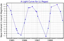 LL Pegasi is obscured at visual wavelengths, but is strongly variable in brightness at infrared wavelengths.[9] It is classified as a Mira variable and has a period of about 696 days.[10]