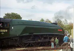 Built by the London and North Eastern Railway (LNER) in 1937 at Doncaster Works and originally numbered 4488, it was named after the Union of South Africa. It had previously been allocated the name Osprey and painted in LNER Apple Green livery on 17 April 1937, but was renamed and repainted into LNER Garter Blue to operate The Coronation. It eventually carried the name Osprey in the 1980s and 1990s.[1] This was due to the contemporary political opposition against South Africa, which undertook a controversial policy of racial apartheid from 1948 to 1994. The name Osprey had previously been carried by A4 No. 4494 (renamed after the LNER director Andrew K. McCosh after 1942) and LNER Peppercorn Class A1 No. 60131 from 1949 to 1965. 60009's name has since reverted to Union of South Africa. The works number was 1853; the plaques are located in the cab itself and not on the exterior cab sides as is the usual practice.