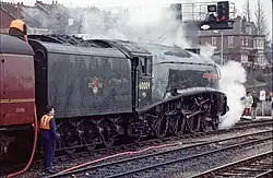 On 24 October 1964 it hauled the last booked steam-hauled train from London King's Cross. It was twenty minutes late through Grantham owing to a broken rail at High Dyke. It was the last steam locomotive to be overhauled at Doncaster whilst in service in November 1963.[4] It was withdrawn from British Railways service on 1 June 1966.