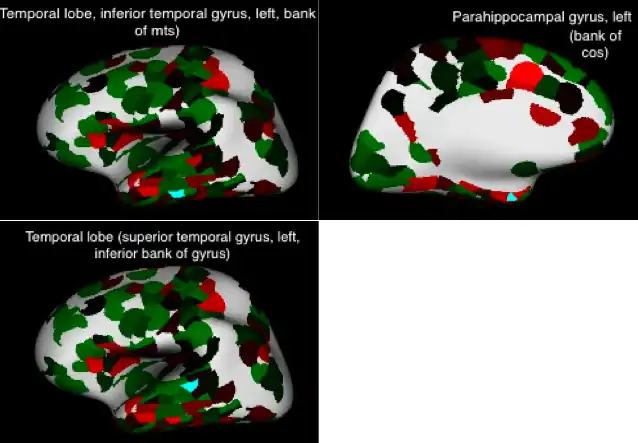 Seven key brain tissues express LOC105377021 according to an Allen Brain Atlas probe.[19] The temporal lobe, parietal lobe, cingulate gyrus, parahippocampal gyrus, and insula are five overarching regions of the seven brain tissues where expression was highlighted. The annotated figures below serve as fairly holistic representations of cranial expression in the context of LOC105377021. Light blue shaded regions posit more dense expression of LOC105377021, where as darker green and brighter red show less and least amounts of expression respectively. All seven expression areas, including the middle temporal gyrus, the short insular gyrus, the postcentral gyrus, the cingulate gyrus, the inferior temporal gyrus, the parahippocampal gyrus, and the superior temporal gyrus are depicted in Allen Brain Atlas profiles below.