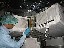 The S6 Truss was swabbed in space on flight day 5, March 19, 2009, during the first spacewalk by Steve Swanson (EV1) and Richard R. Arnold (EV2). This 'swab' was performed indirectly with the spacesuit gloves. The gloves themselves were swabbed inside the ISS both before and after EVA, with LOCAD-PTS, by Expedition 18 Flight Engineer Sandy Magnus. Swab samples were then analyzed aboard the ISS by Magnus on flight day 7, March 21, 2009. This experiment marked the first time in human spaceflight that EVA crew checked themselves for microbes before EVA, and was mentioned by the STS-119 crew to President Obama during a video conference from space during STS-119.[24] This type of procedure will be required to monitor and document the spread of biological material in support of NASA's goal to search for life on other planets[25] and to comply with planetary protection regulations.