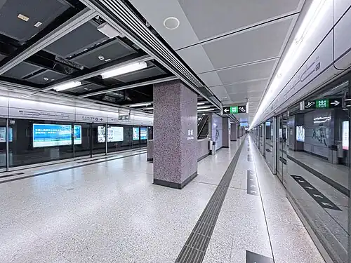 There are two platform faces on an island platform. Like in other underground MTR stations, platform screen doors have been installed.[8]