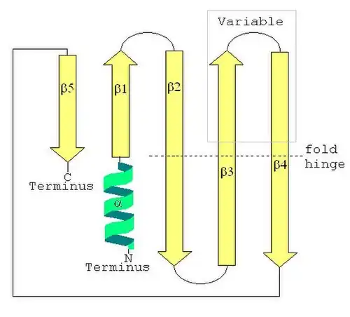The secondary structure of a LSm protein is a small five-strand anti-parallel beta sheet, with the strands identified from the N-terminal end to the C-terminal end as β1, β2, β3, β4, β5. The SCOP class of All beta proteins and the CATH class of Mainly Beta are defined as protein structures that are primarily beta sheets, thus including LSm. The SM1 sequence motif corresponds to the β1, β2, β3 strands, and the SM2 sequence motif corresponds to the β4 and β5 strands. The first four beta strands are adjacent to each other, but β5 is adjacent to β1, turning the overall structure into a short barrel. This structural topology is described as 51234. A short (two to four turns) N-terminal alpha helix is also present in most LSm proteins. The β3 and β4 strands are short in some LSm proteins, and are separated by an unstructured coil of variable length. The β2, β3 and β4 strands are strongly bent about 120° degrees at their midpoints The bends in these strands are often glycine, and the side chains internal to the beta barrel are often the hydrophobic residues valine, leucine, isoleucine and methionine.