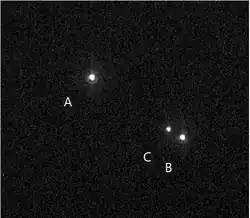 ![]() Hubble ACS/HRC image showing all three stars. Upper left is LTT 1445 A and in the lower right part of the image is the LTT 1445 BC pair. | |