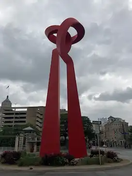The sculpture has two posts that rise at non-parallel angles. The posts appear to rise straightly until they individually curl and twist before meeting at the highest point of the sculpture. The sculpture is lit constantly, and with varying colors and light patterns at different periods of the year.[4] The sculpture is geometric but does not seem to form any strictly right angles. From each angle surrounding the sculpture, the shape at the top appears to be from a different sculpture. Due to the location, the one perspective that is often inaccessible is that right under the sculpture, as it is located on a rotary island in a busy traffic intersection.