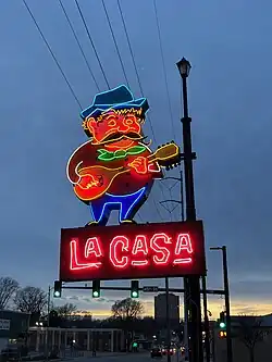 The mascot for La Casa is named 'Peppi' (sometimes spelled Pepé) and is featured prominently at each location with a neon sign. The neon sign featuring Peppi was first constructed in 1957 and was originally designed as part of a larger neon sign trend in Omaha at the time. Peppi is depicted as a stout, 'troubadour' with a handlebar mustache who plays a mandolin or guitar. The designer is unknown. In 2002, the Peppi neon sign at the original La Casa location was declared an Omaha Landmark by the Landmarks Heritage Preservation Commission.[5][3]