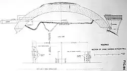 As an additional bomb-proofing method, the dome was surrounded by a bomb-proof "skirt" or Zerschellerplatte of steel-reinforced concrete, 14 metres (46 ft) wide and 2 metres (6.6 ft) thick. This was supported by a series of buttresses, which were not tied into the dome itself, above the entrances to the Gustav and Gretchen tunnels. Another concrete structure was tied into the skirt to the north-west of the dome, which was perhaps intended for use as an observation and control tower. A separate underground building was constructed on the western side of the quarry to serve as a hospital and as offices for the engineers.[23] A Decauville narrow-gauge railway was installed on the quarry floor to transport supplies from the main line to the construction site.[24]