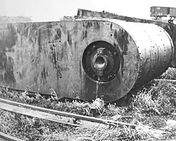 Conventional bombing raids only achieved a single bomb hit on the dome itself, causing negligible damage. However, in June and July 1944 the RAF began attacking the site with 12,000 pounds (5,400 kg), ground-penetrating Tallboy bombs.[16] The external construction works were completely wrecked by the bombing and one Tallboy landed just beside the dome, blowing out the entire quarry cliff face and burying the entrances to the Gustav and Gretchen tunnels. The entrance to Sophie was also buried, leaving Ida as the only entrance to the facility. The dome was unscathed but the buttresses supporting the protective Zerschellerplatte were dislodged and slid partway down into the quarry. Serious damage was also caused to the tunnels beneath the dome. The damage made it impossible to continue work on the site. Dornberger complained: "Persistent air attack with heavy and super-heavy bombs so battered the rock all around that in the spring of 1944 landslides made further work impossible."[27] His staff reported on 28 July 1944 that, although the dome had not been hit by the Tallboys, "the whole area around has been so churned up that it is unapproachable, and the bunker is jeopardised from underneath."[27]