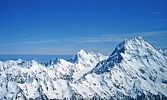 La Perouse is located in the Southern Alps of the South Island, four kilometres to the southwest Aoraki / Mount Cook.[1] Unlike Aoraki / Mount Cook, La Perouse sits on the South Island's Main Divide, on the border between Aoraki / Mount Cook National Park and Westland Tai Poutini National Park. On the northern side, the La Perouse Glacier feeds the Cook River that flows into the Tasman Sea.[2]