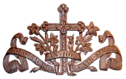 In front of the altar, the pavement is decorated with neo-Romanesque pattern, and bears the inscription "Pavete Sanctuarium meum ad", i.e. : "Be fearful at the approach of my sanctuary" Just above, a winged dragon twists inside three circles. The initials of the couple at the origin of the chapel, Fortuné and Thomasine Broquier are drawn on each side of the altar.