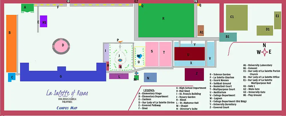 It has seven sister schools also all named La Salette and are also all located in the province of Isabela. They are as follows: La Salette of Aurora, La Salette of Quezon, La Salette of Ramon, La Salette of San Mateo, La Salette of Cabatuan, La Salette of Cordon and University of La Salette- Santiago City. It is a Catholic school which provides the youth of the town of Roxas an education on the Catholic Faiith. The Blessed Virgin Mary under the title Our Lady of La Salette is the patroness of La Salette of Roxas.