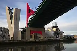 Today, the main landmark of the area is La Salve Bridge, popular name for the Princes of Spain cable-stayed bridge, built in the 1970s to provide a northern access over the river to the city.[1] This bridge gained popularity when the Guggenheim Museum Bilbao was built right under it, literally merging its structure into the museum's.