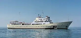 La Sultana is a yacht that has been refitted from a Soviet era ferry. She was launched in 1962, under the name Aji-Petri and was the fifth in a series of 12 ships that were originally built for the Russian fleet. Her purpose was to transport freight and passengers between the ports of Odessa, Yalta, Sebastopol and Istanbul between the Azov and Black seas.[3][4] During the Cold War, the ship was believed to be used as a Soviet spy vessel.[5] During the refitting process several spying instruments were discovered, including a radioactivity detector and thick aluminum insulation across the entire boat.[6]