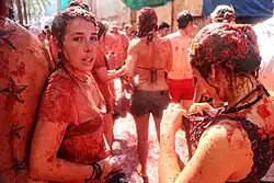 La Tomatina is a Spanish festival in Buñol, Spain where participants throw tomatoes at each other. It is said to be the biggest food fight in the world.[1][2] From the festival's origin as a food fight between friends in the 1940s, it has become a famous tourist attraction. Until 2013 there was no limit to the number of participants; in 2013 the festival became a ticketed event for no more than 20,000, so as not to overwhelm Buñol's population of about 9,000 people.[3]