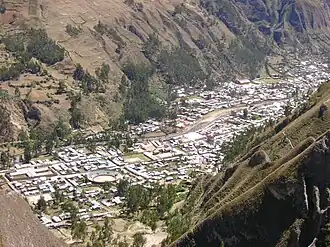 During the Inca period, the town saw the relocation of the mitmakuna,[2] later referred to as mitimaes by the Spanish, under the state’s policy of population resettlement. Named Aguamiro (Quechua for textile factory[2]) for its association with textiles, these relocated groups became part of the resource and production network of the provincial capital of Wanuko. This focus on textiles persisted into the colonial era, when the town became a center for obrajes.