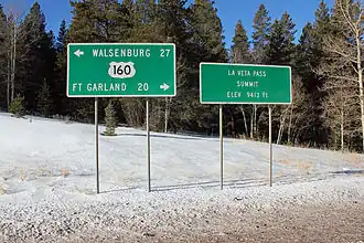 New La Veta Pass (officially North La Veta Pass), elevation 9,413 ft (2,869 m),[1] lies about 1.6 miles northeast of the old pass and is now the principal highway route through this part of the mountain range, carrying U.S. Highway 160.[3] While this new route is slightly higher, it has no sharp curves and is thus better suited to modern highway traffic.