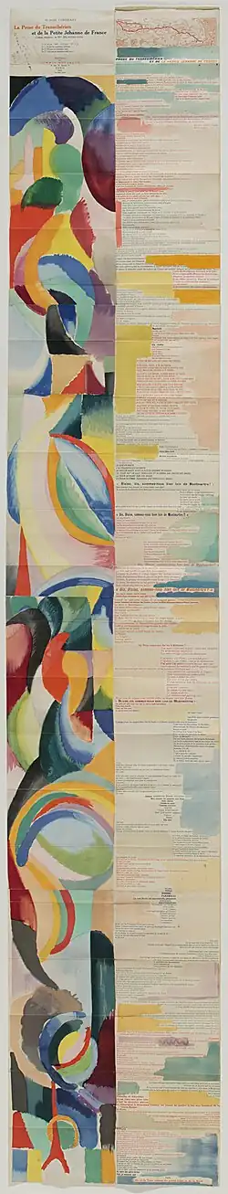 La prose du Transsibérien et de la Petite Jehanne de France (Prose of the Trans-Siberian and of Little Jehanne of France) is a collaborative artists' book by Blaise Cendrars and Sonia Delaunay-Terk. The book features a poem by Cendrars about a journey through Russia on the Trans-Siberian Express in 1905, during the first Russian Revolution, interlaced with an almost-abstract pochoir print by Delaunay-Terk. The work, published in 1913, is considered a milestone in the evolution of artist's books[1] as well as modernist poetry[2] and abstract art.